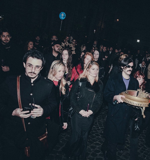 Artisti, attori, galleristi, critici e altri protagonisti del panorama culturale contemporaneo romano si sono riuniti nel centro storico della città per prendere parte alla manifestazione de Il funerale all’amore romantico, a cura del mecenate Giovanni Calvario e dell’attore Alessandro Gasparetti. La performance corale, che ha contato un centinaio di partecipanti, accompagnata da una banda jazz di fiati e ottoni, si è svolta il 14 febbraio ed è stata realizzata in collaborazione con Valerio Scifoni (Organizzazione Scifoni) e con la documentazione fotografica di Mattia Mari.
