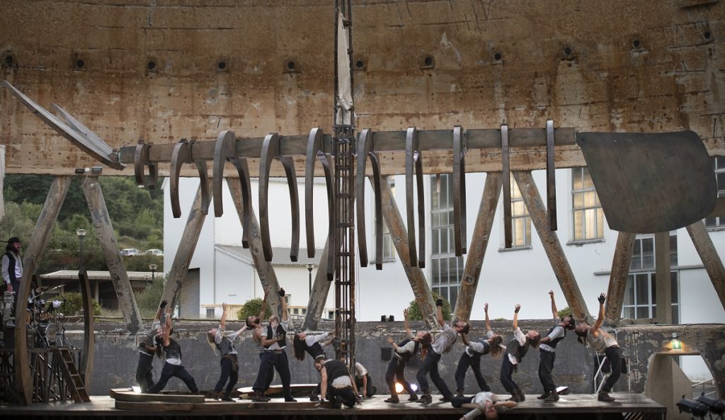 All’interno dell’Arena Geotermica, ricavata in una torre di raffreddamento mai completata, affascinante esempio di archeologia industriale, mentre tre musicisti suonano live, dettando il ritmo dell’azione, tredici danzatori-circensi animano e costruiscono letteralmente la scena, maestosa opera firmata Dino Serra: tre anni di lavoro, un bilico per il trasporto, per un palco-carro-nave, corpo della disperata ricerca dell’illusione del capitano Achab. Lui, con la gamba rigida e inerme, si muove lento e guardingo attorno alla sua meta, che pian piano prende vita, scheletro e fantasma di un sogno non ancora raggiunto. Opera maestosa capace di parlare differenti linguaggi drammaturgici arrivando così a catturare l’attenzione di un pubblico vasto e variegato e riaffermando l’importanza di un teatro fatto di gesti e passione.