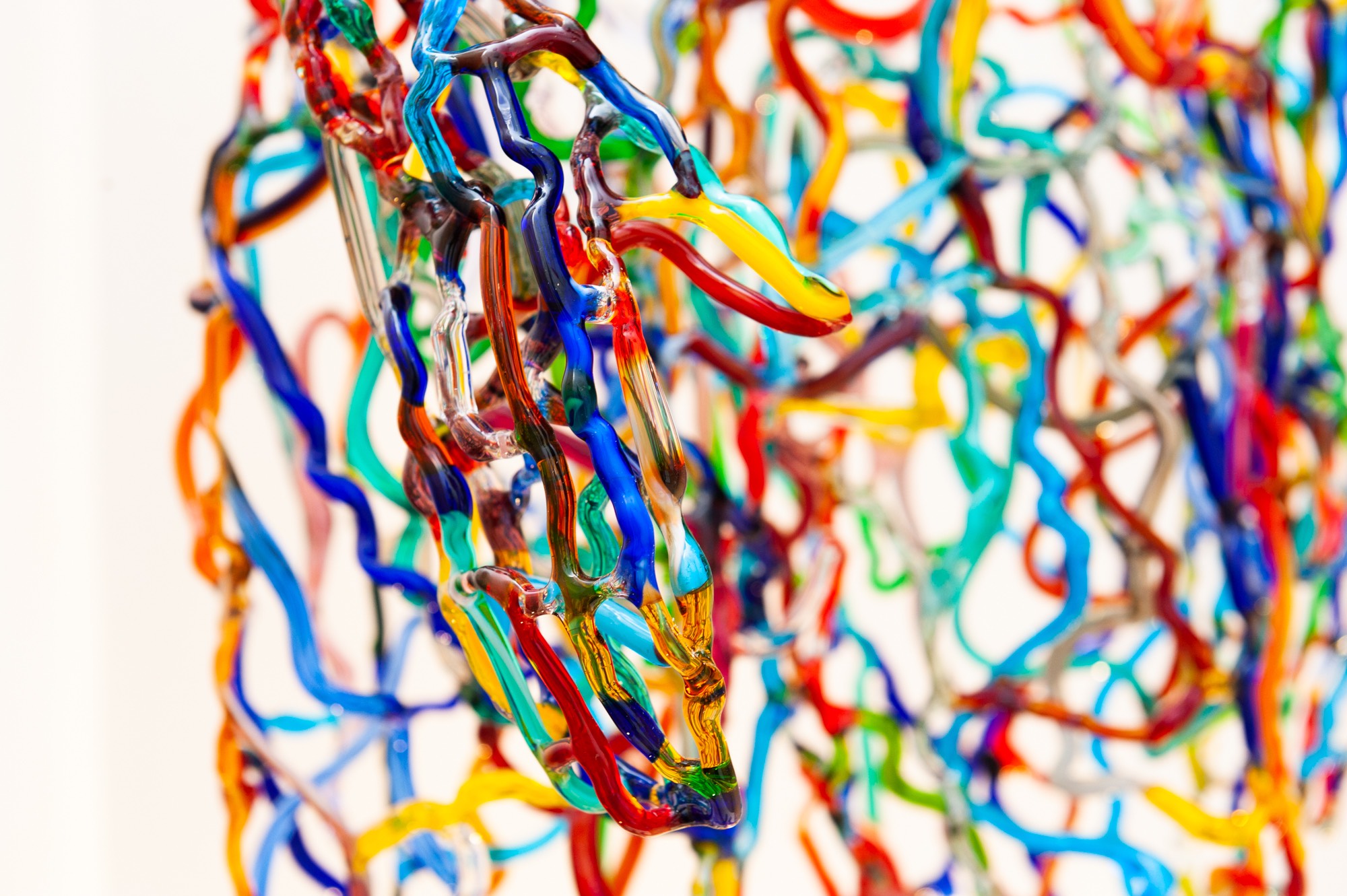 Cosi le due sculture di Bonaventura, Homo Erectus e Flying, complessi intrecci vitrei monocromo e policromo, sono il frutto di un lungo lavoro di fusione, raffreddamento, prove di equilibrio, legature e cuciture simili a una stoffa pregiata confezionata da un’antica sapienza levantina e destinate a nobili sguardi.
