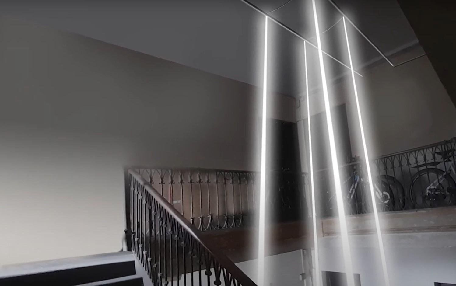 Corpo in Moto sarà anche funzionale: illuminerà le scale di un condominio, portando la luce in senso poetico, pittorico e pratico. La scultura è composta da una struttura alla base e una scia di tubi LED, estendendosi per 15-20 metri in altezza e 2-3 metri in larghezza. Alessandro Vela si occupa dell’allestimento tecnico e dell’installazione luminosa, valorizzando l’opera con un’impeccabile resa visiva.