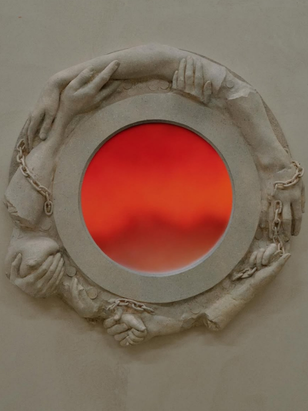 I bassorilievi in gesso di Keith-Roach accentuano l’edificio stesso: parti del corpo emergono dalle pareti e si combinano con materiali da costruzione — mattoni, tubi, legno — mostrandosi non solo come elementi ornamentali, ma anche come strutture che contribuiscono a costruire Bar Far, come Cariatidi infrastrutturali. Il wall painting di Page trasforma l’ultima stanza in un colonnato o in un chiostro illusorio — sebbene non rivolto verso un paesaggio celestiale, bensì verso un’infinità minacciosa che ci attira con un bagliore ambiguo e ultraterreno.