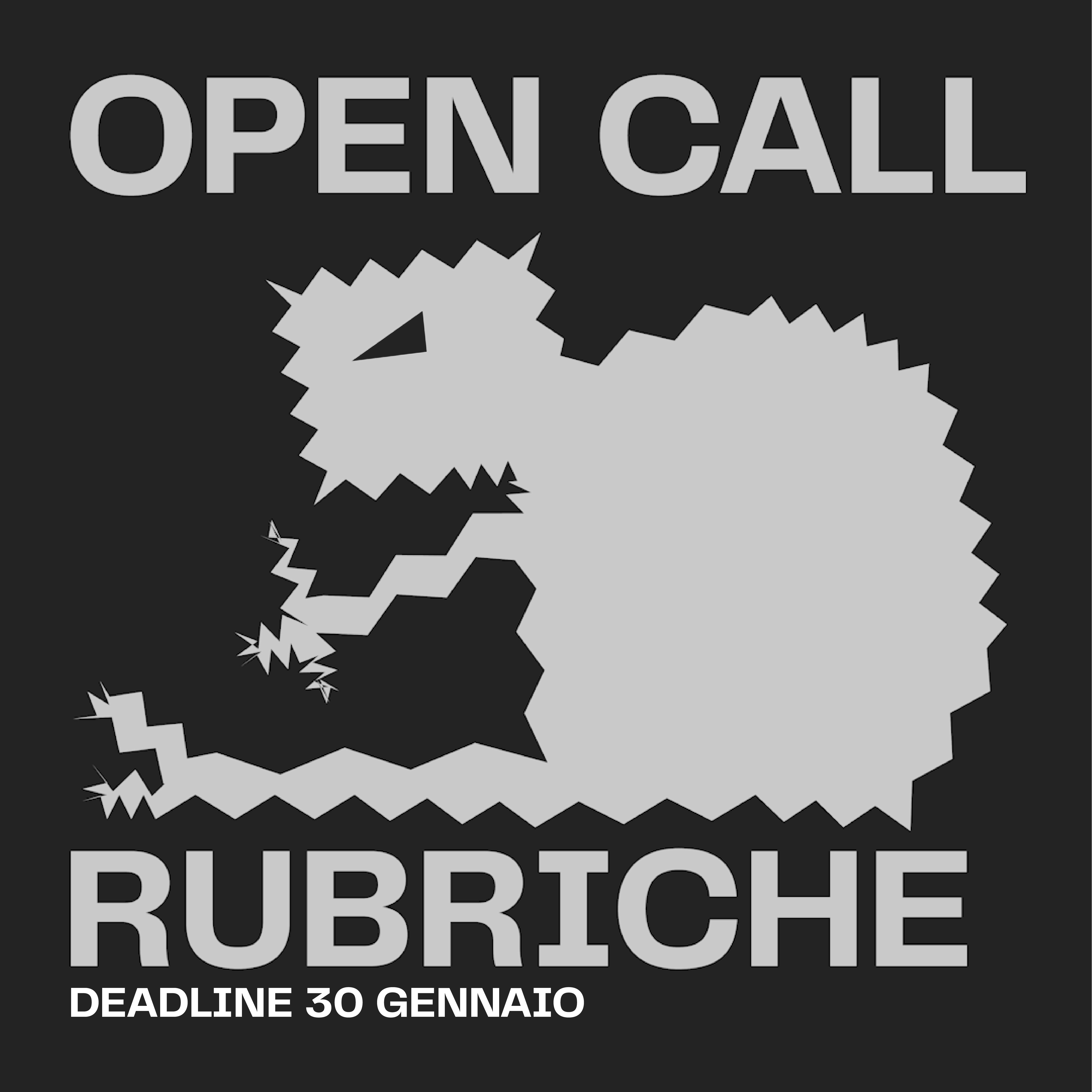 «Il mese scorso abbiamo lanciato una open call per la sezione #RUBRICHE, che abbiamo prorogato sino al 30 gennaio. Il concetto non cambia rispetto alle due rubriche di lancio: ripensare tale formato con una metodologia decostruttiva. Vogliamo accogliere proposte che utilizzano la rubrica online e offline come veicolo di contenuti visuali, testuali, sonori e archivistici. Riguardo la parte offline, ci piacerebbe ricevere anche progetti di rubriche con numeri da realizzare irl, come mostre, eventi o performance».