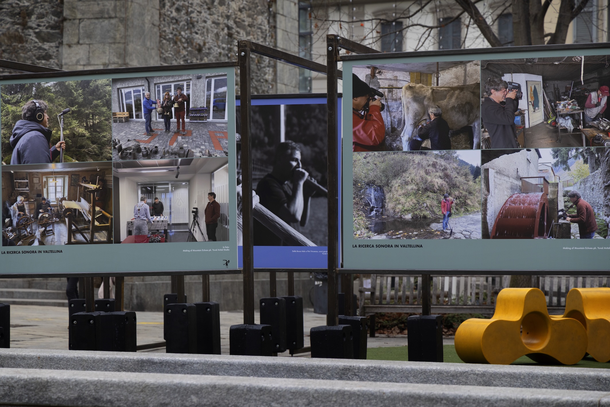 Accanto alle sculture sonore, il progetto comprende anche una mostra fotografica diffusa, Mountain Echoes in Valtellina: lo sguardo dell’artista, che documenta il processo di ricerca e relazione alla base dell’opera. Le immagini restituiscono un ritratto inedito del territorio, mettendo in primo piano persone, gesti, materiali, economie locali e paesaggi, in un dialogo continuo con la componente sonora.