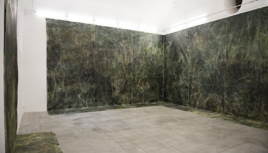 In un ambiente sono state allestite alcune monumentali tele senza cornice, che paiono soffrire sia della altezza della sala, insufficente alla loro completa estensione, sia delle finestre che ne interrompono la continuità (rovinando forse l’effetto immersivo che avrebbero altrimenti). Eppure, l’effetto è ugualmente d’impatto: la superficie è trattata (anzi, maltrattata, viste le impronte e le tracce su di essa – la tela è stata lavorata all’aperto) con pigmenti ottenuti da essenze naturali, tra cui una soluzione di menta e miele, e il risultato è una pittura astratta, verde, vibrante e mutevole – che ricorda elementi naturali come il marmo verde o un qualche intrico vegetale – nello stile di altre opere dell’artista, come il mastodontico Ginger Glacier di qualche anno fa.
