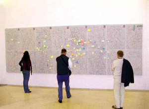 Intanto alcune di queste idee, in forma di progetto, di appunti, di immagini compongono un allestimento, presentazione e dichiarazione d’intenti di Between Dresden & Prague: fili colorati sono tesi lungo i muri, quasi un simulazione ingenua del viaggio che sarà, riprendono la rete di percorsi che s’interseca sul pavimento, una delle pareti vetrate è diventata la superficie per disegnare una mappa, dei post – it individuano le tappe, le frasi scritte velocemente sono il to do, il promemoria indispensabile; i nodi di questa maglia sono i lavori degli artisti, ancora sparpagliati tra fogli, fotografie, frammenti di dialoghi, proiezione di diapositive, di immagini video.
