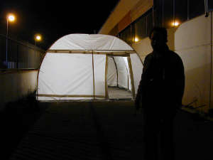 in collaborazione con Gregorio Galli: da sotto la tenda, dove al momento non trova ospitalità nient’altro che un fitto sovrapporsi di segmenti colorati ed un piccolo contenitore con libri, cataloghi, pubblicazioni. Diventerà una sorta di luogo d’incontro, questo igloo di 5 x 8 x 3 metri, uno spazio che dovrebbe essere contemporaneamente dentro le coordinate geografiche in cui effettivamente si trova e fuori di esse, oltre i confini… dopo aver compreso identità, differenze e quell’inafferrabile essenza che è propria di un posto.
