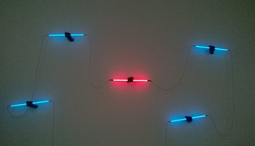 L’allestimento minimal è più che azzeccato per le poche opere che però sono dense di significato. Note anche le sue lampadine colorate a neon, come quella color sabbia dell’Africa non in mostra ma evocata nel video di 35’ Are you thinging for me?. Tema ricorrente oltre all’uso del neon e al bisogno di libertà, è il senso dell’evanescenza e del vapore come quello, molto particolare, che resta intrappolato nella valigia Nasconditi arte.