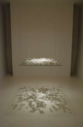 Il secondo appuntamento della rassegna Giochi dialettici ha come protagonisti Sabrina Mezzaqui (Bologna, 1964; vive a Marzabotto) e Cesare Pietroiusti (Roma, 1955). Personalità diverse per generazione e tipo di ricerca, ma accomunate da uno sguardo attento alle cose minute della vita e dall’attitudine a un lavoro paziente e rigoroso. Da qui l’idea di mettere in corrispondenza i due artisti all’interno di una mostra che nasce come risultato di un dialogo a due, anzi a quattro (contando le curatrici) e di un confronto vissuto prima a distanza e poi direttamente nell’allestimento dello spazio espositivo. Un dialogo a più voci che in questo caso s’infittisce ulteriormente con l’opera di Sabrina Mezzaqui Le Parole tra noi leggère (2004), ispirata all’omonimo libro di Lalla Romano e portatrice, idealmente e fisicamente, della storia raccontata in quelle pagine, scritte dall’autrice nel tentativo di intessere un rapporto con il figlio. Con queste l’artista ha realizzato centinaia di origami soffiati, disposti su una lastra di vetro sospesa a mezz’aria, con il risultato –fortuito quanto efficace– di proiettarne sul pavimento l’ombra: evanescente e impalpabile, piatta e scura, per sua natura simile eppure diversa rispetto a ciò che l’ha prodotta e capace della misteriosa malia di far vedere il vuoto come pienezza. Così come è ambiguo quel vetro squadrato, elegante nella sua precisa trasparenza, ma rigido e freddo quanto le parole scelte dalla Romano per riuscire a capire ciò che non ha mai saputo comprendere: la diversa bellezza dell’identità dell’altro. Un altro di cui denuncia l’estraneità, ma su cui vuole dire l’ultima parola. Amore materno? Tanto quanto quello rappresentato da Marco Bellocchio in L’ora di religione. Il sorriso di mia madre (2002).