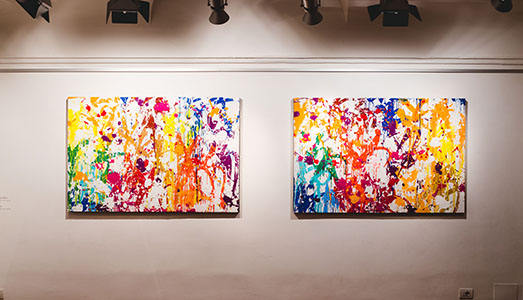 L’artista, di origini domenicane e dai natali newyorkesi, adottato dalla Francia che gli ha riservato la Legione d’onore, ha portato in mostra venti tele realizzate appositamente per l’appuntamento espositivo ed ha realizzato una performance pittorica di grande impatto visivo. Il rapporto con la tela tradisce la conflittualità con uno spazio che ha sempre una fine, a differenza di quello urbano. “Non ho ricevuto alcuna educazione artistica: all’epoca in cui taggavo i treni a New York, non avrei mai immaginato che un giorno mi sarei espresso su tela” dice l’artista. E allora scrive, in una lingua fatta di segni, colori e materia pittorica. Una lingua che il fruitore è in grado di leggere, concentrato e lontano dal fragore della vita cittadina, dal flusso in cui siamo abituati ad inglobare i segni dell’arte urbana. Un lavoro, quello di JonOne, definito “vecchia scuola” ed espressione del graffitismo americano di seconda generazione poi importato con successo in Europa e da dieci anni sottoposto alla prova dell’esposizione museale, che sembra decisamente superata visto il successo delle mostre che lo stesso JonOne ha realizzato in giro per il mondo. A Roma le opere sembrano approfondire la vocazione calligrafica dell’artista, con variazioni cromatiche su tema o narrazioni costruite con un utilizzo combinato del tratto come elemento segnico e costruttivo e del colore come collettore degli aspetti emozionali legati all’opera.