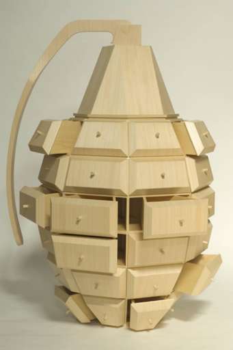 Oltre la forma vanno anche Los Carpinteros, il duo cubano composto da Marco Castello (Cuba, 1971) e Dagoberto Rodriguez (Cuba, 1969). Otto gli acquarelli esposti, tutti giocati sulle sovrapposizioni di senso: Cama-Bed è un’autostrada a forma di letto, mentre in Formación en V una serie di biciclette si schierano in formazione da guerra. Pool-Pool, sfruttando il gioco di parole (pool in inglese vuol dire specchio d’acqua ma anche biliardo) costruisce una piscina con le sembianze di un biliardo; in Coco Solo le infradito in gomma con incisa sulla pianta la mappa dell’Havana, evocano la problematica dell’emigrazione, dei confini e del conflitto con l’America, così vicina e così distante. Infine, una scultura in legno chiaro, Granada de Mano (2004): una bomba a mano gigante (realtà dei tempi moderni) rappresentata con cassetti aperti vuoti e liberi. A chi tocca sistemarli?