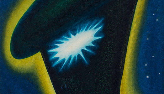 Per l’occasione, le diverse opere dell’artista lucano sono state collocate ad un’altezza superiore rispetto al livello dello spettatore, al fine di favorire il dialogo con l’opera di Mochetti e il riferimento al tema celeste della mostra. Le tele di Tommaso Lisanti presentano tutte un rimando al tema caro all’artista – e per questo adatto al progetto – degli alieni: terre sconosciute, abitanti di galassie lontane, soggetti misteriosi. L’artista si serve di uno stile volutamente imperfetto, in cui sovverte le classiche regole pittoriche, prospettiche e coloristiche per dare vita a un immaginario fatto di sistemi solari e cartoline spaziali. Un linguaggio semplice, ricco di riferimenti ai grandi autori del passato, dai colori brillanti e vivaci, a volte stridenti, altre volte più morbidi. Secondo un’attitudine visionaria, Tommaso Lisanti indaga, a partire dagli anni ’90, il nuovo rapporto tra la fantascienza e le arti visive, prendendo a modello il genere letterario e cinematografico della Science Fiction. Sempre pervaso da un alone di mistero, lo stile dell’artista denota uno sguardo costante a Gino De Dominicis, simbolo di un’arte come discesa nel profondo. Con le sue istantanee galattiche, l’artista non intende preannunciare catastrofici attacchi marziani, quanto piuttosto documentare la fisionomia aliena attraverso l’unica forma di raffigurazione a suo avviso possibile. Un binomio, quello Lisanti-Mochetti, che illustra il campionario iconografico che la scienza produce, con un catalogo per l’occasione dedicato all’astronauta italiana Samantha Cristoforetti. @AstroSamantha