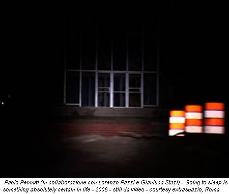 È notte. L’immagine è inizialmente confusa; grate metalliche e recinzioni impediscono allo sguardo di orientarsi nello spazio. Il piano-sequenza, realizzato da Paolo Pennuti (Forlì, 1974) con l’uso di una camera-car, procede con un ritmo incostante, con accelerazioni e rallentamenti. Nell’oscurità, la luce di un faro, posto sopra la videocamera, svela frammenti di un luogo sconosciuto, dettagli ancora indefiniti ma inquietanti.