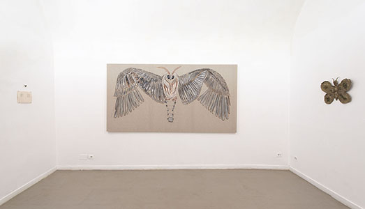Quella di Evgeny Antufiev da Z2O Sara Zanin gallery è una mostra che ricalca, con significative variazioni, il progetto presentato l’anno scorso dal giovane artista russo alla biennale “Manifesta 11”. È vero. È stata definita “emblematica”. E lo è indubbiamente. E anche “lieve”. Ma questo aggettivo, a mio avviso, è poco calzante. Perché è una mostra complessa, sapida di enigmi, visioni allucinate, inganni. Sì, proprio così. E il primo inganno è proprio l’apparente leggerezza del soggetto reiterato, la farfalla, e dei linguaggi utilizzati, come il ricamo, le fantasmatiche fusioni in bronzo e in ottone, oppure le evanescenti fotografie. Il secondo inganno è l’evidente eleganza dei manufatti per irretire i riflessi dell’osservatore, tutti plasmati o tessuti, uno per uno, da Antufiev stesso. Con quella calma e pazienza di chi ha premeditato a lungo quanto, poi, ha inteso mettere in scena. Il suo fattore scatenante, o “trigger” che dir si voglia, è la scoperta della passione di Vladimir Nabokov, l’autore di “Lolita”, per le farfalle. Anzi, sembra che Nabokov abbia scritto il suo romanzo più famoso e scandaloso viaggiando per gli Stati Uniti insieme alla moglie, armato di retino per dare la caccia alle farfalle. La sua prima farfalla, stando ai resoconti ufficiali, l’aveva catturata nel 1906: e questo costituì un momento topico nella sua vita: “Ho spesso sognato – diceva Nabokov – di una lunga ed eccitante carriera come un oscuro curatore di lepidotterologia in un museo famoso”. E così fece. Tra il 1942 e il 1948, in qualità di ricercatore associato presso il Museo di zoologia comparata dell’Università di Harvard.