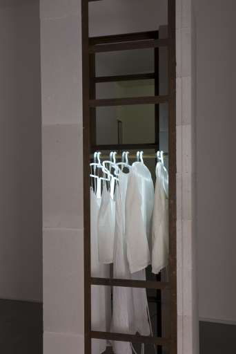 Come in altre occasioni anche questa volta l’artista ha fatto uso di elementi luminosi. È il caso di Pentalux, un massiccio armadio di cemento e ferro che accoglie grucce luminose a cui sono appesi abiti bianchi. La luce del neon si insinua dall’interno dei vestiti come una struttura ossea vista attraverso una radiografia, creando un’atmosfera affascinante e futuristica. Atmosfera alla quale si contrappone 4 finestre, una serie di pannelli dove l’abituale mondo caotico e industriale di Messina trova riposo nella serenità -e serialità– del monocromo.