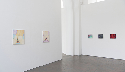 Il paesaggio sicuramente meno mimetico, ma che raggiunge la più alta qualità in termini estetici è il corpus di lavori più conosciuto del percorso di Celia Hempton, ovvero la sua serie di nudi, tra i quali in quest’occasione viene esposto anche un ritratto dell’attore porno Colby Keller. Così come per le esplosioni laviche, anche questi ritratti sono ripresi ‘dal vero’, ma una volta ingigantiti, i particolari di genitali maschili e femminili vengono resi dall’artista al pari di alture o crateri vulcanici, perdendo la loro identità meramente sessuale e il loro possibile riferimento pornografico. Il colore in questa serie di ritratti è disteso e ritrova la leggerezza materica nei colori tenui, ben distanti dall’aggressività dei paesaggi naturali immersi nell’oscurità.