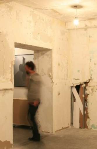Appollaiato com’è sul crocevia tra incombenza “tettonica” degli elementi e dynamis entropizzante di un paradigma fisico “fluido”, pulviscolare, non più regolato dalla geometria euclidea, Jorge Peris (Valencia 1969; vive a Madrid e a Londra) non poteva lasciarsi sfuggire un’occasione del genere. E lo stesso avrebbero fatto artisti come Gregor Schneider o Hans Schabus. Con un fiat secco e totalizzante, agendo simultaneamente “per via di levare” e “di porre”, lo spagnolo ha letteralmente –materialmente– duplicato l’ambiente minore nel locale più grande, quello già “doppio” perché suddiviso. Ha rivestito pareti e soffitto con robusti fogli di resina, ne ha divelto ogni singolo metro quadro (circa) e ha quindi trasferito il ricavato –il “rimosso”, che paradossalmente sta in superficie–, nel bel mezzo delle altre due “stanze”.