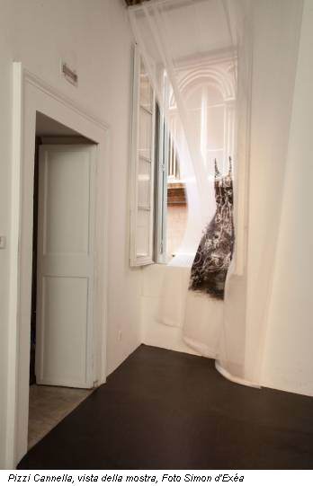 L’opera di Pizzi Cannella si sostanzia nella pittura di 9 abiti femminili pressati su alte tende che fluttuano al vento. Non ci sono né quadri né performance o pièce teatrali.