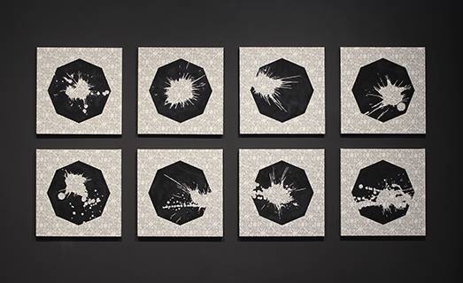 Con moquette di colore “nero” l’artista decide di rivestire l’intero spazio di Bibo’s Place. Con il titolo “8” si vuol far riferimento non solo ai rimandi geometrici naturali e animali, ma anche a quelli matematici. L’inversione del numero rimanda al simbolo dell’infinito, agli sconfinati abissi oceanici e a quelli spaziali nei quali l’artista ci condurrà. Come in un gioco di opposti, dapprima esploriamo gli abissi bui, luogo ideale per i cefalopodi il cui inchiostro (uno dei pochi elementi di colore nero reperibile in natura) in passato era usato in sostituzione alla china. Questi animali, in caso di pericolo, cacciano il proprio nemico attraverso un getto d’inchiostro, con l’obiettivo di compromettere il campo visivo e l’orientamento. Lo stesso schizzo che in natura viene utilizzato per “allontanare”, qui è reso dall’artista per “catturare” lo sguardo curioso dello spettatore. “Un ribaltamento funzionale dell’elemento che si riscontra anche dal punto di vista estetico. Infatti si passa da una macchia piena e corposa capace di annientare qualsiasi figura o immagine, ad un effetto in negativo, ovvero di sottrazione; attorno allo schizzo troviamo l’inchiostro e dove dovrebbe esserci l’inchiostro troviamo un intrecciarsi di immagini – pattern- che ricoprono tutte le tele dello spazio” così ci spiega l’artista. Queste textures sono studiate affinché le figure dei cefalopodi possano conglomerarsi con i nodi celtici in una geometria ottagonale ben delineata. Un intreccio continuo che crea un caotico groviglio dove ogni cosa pare sempre significare tutto e il contrario di tutto. Scendendo nel piano inferiore della galleria sprofondiamo nello sconfinato Universo. Un cielo così oscuro, freddo e distante eppure così vivo e pulsante. Qui possiamo camminare su Marte, sentirne le imperfezioni terrene; vedere gli ultimi istanti, quasi umani, dello schianto della sonda Messenger su Mercurio. Una visione romantica dove l’artista tenta di dare un’anima a questi robot che sono i nostri occhi e le nostre gambe quando esplorano i pianeti incontaminati dello spazio. Riproduzioni, fedeli nelle fattezze, in stampa 3D di asteroidi che non portano con sé i migliori auspici, e di pianeti celebrativi come “Vesta” con i suoi mille crateri, tutti intitolati con nomi di vestali romane.