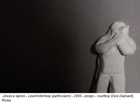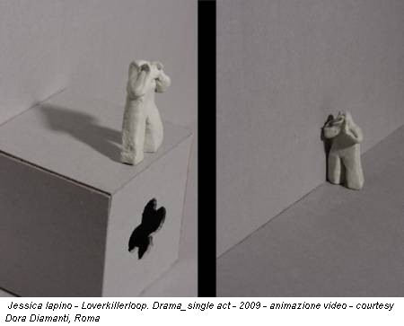 Sembrano strappati alla materia grezza i protagonisti del video in stop-motion e delle microambientazioni scultoree di Jessica Iapino (Roma, 1979). Sono come minuscoli Golem della leggenda talmudica legata alla creazione: embrioni umani allo stadio primordiale, antecedente il soffio divino. Dove il limo, qui divenuto pongo, indurito dall’esposizione agli elementi e sbiancato dal fuoco di passioni impraticabili – per assenza d’identità psichica e fisica dei soggetti – è simbolo di purezze superflue, senza traviamento.