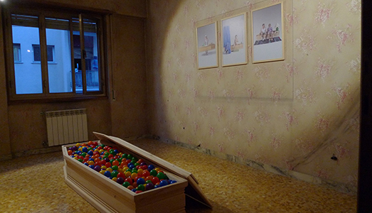 Questo è per Isotta Bellomunno, napoletana di origini e con una storica tradizione di onoranze funebri alle spalle. Quest’ultima esorcizza la cara amica lavorando sulle proprie origini nel periodo in cui studia all’Accademia di Brera. Gioca e scherza con l’elemento funebre per antonomasia dandogli una connotazione quotidiana, più di quanto non lo sia già. Nell’installazione site-specific per Casa Vuota la bara diventa una “ball-box”, nelle foto si trasforma in una comunissima vasca, un bancone dove ammassare il pane e un divano dove guardare la televisione. Un elemento che racchiude in sé le fasi del quotidiano.