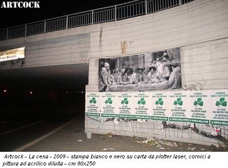 Il piccolo “tempio” della street art romana è stato interamente tappezzato con le foto-poster degli Artcock, il collettivo formato dai tre fotografi Federico Maria Tribbioli (Roma, 1987), Niccolò Berretta (Roma, 1986) e Filippo Silli (Roma, 1987), che collaborano da due anni e che hanno dato vita al gruppo attivo sulla scena della Poster Art. I grandi poster fotografici affissi alle pareti della galleria/studio sono ispirati ai classici della pittura: si va dal Cenacolo al San Sebastiano, dalla Deposizione al Narciso. Gli spazi rimasti liberi sulle pareti e sul soffitto sono ricoperti da fotografie di piccolo formato, relative ai backstage delle opere presentate. Le foto sono tutte rigorosamente in bianco e nero e hanno cornici barocche, sempre stampate su carta fotografica e colorate a mano in oro.