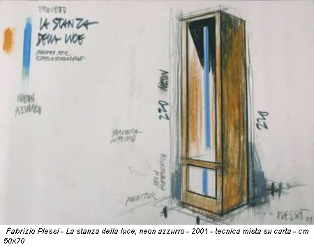 La stanza della luce (2001) si erge a protagonista assoluta dell’esposizione, quasi fosse una presenza totemica: un neon blu chiuso in una scatola di ferro diffonde la sua luce algida, mentre in basso la sua immagine è riproposta su un monitor. La potenzialità dinamica del video non viene però sfruttata e il neon appare immobile, uguale a sé stesso, copia perfetta dell’oggetto presentato nella sua essenza fattuale. Impossibile non pensare alla poetica minimal di Dan Flavin il quale, a differenza di Plessi, insiste su un utilizzo situazionale del neon, in relazione con l’ambiente circostante. La scatola “povera”, che funge da cornice e prigione dell’elemento luminoso, altera dunque la sua relazione con lo spazio; trasforma l’oggetto in cariatide (titolo della serie di Plessi), rendendolo più scultura e meno ready-made. Nell’accostamento di immagine reale e immagine video, Plessi sembra proporre una tautologia kosuthiana, aiutata dalla documentazione grafica che accompagna l’installazione. L’oggetto per ciò che è, l’oggetto per come noi lo (ri)conosciamo.