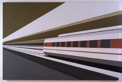 Uno spazio, cinque pittori e due semplici regole: un solo lavoro per ciascun artista e un unico formato (2 metri per 3). Ma, si sa, che le regole sono fatte (anche) per essere trasgredite. È il caso di Luca Padroni, autore di Prospettiva Attesa: una pittura che fuoriesce dai confini della tela per espandersi in un wall painting, che riesce a far sentire sulla pelle l’energico movimento veloce del treno, com’è lasciato sulla retina e nel ricordo.