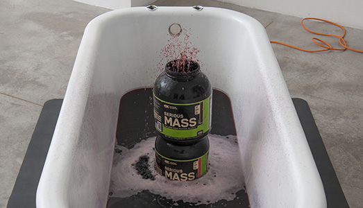 Il peso più grande che incombe sull’esistenza di Jane Fonda è senza dubbio quello del suicidio della madre, avvenuto durante un ricovero per problemi psichiatrici, quando la figlia era appena dodicenne: la donna si tolse la vita tagliandosi la gola. La tragedia è messa in scena come nella migliore tradizione della cinematografia americana anni ’70, dove l’atto finale avveniva quasi sempre nella vasca da bagno, quasi a diventarne scenografia obbligata. Hudson realizza un’installazione di forte impatto, utilizzando una vasca da bagno vecchio stile con all’interno un grande barattolo di “serious mass” (un integratore proteico americano, il cui nome tradotto rende anche il gioco di parole di massa considerevole, quindi anche di una massa corporea a buon bisogno), che zampilla senza sosta del vino rosso, a simulare una testa sgozzata dalla quale fuoriesce sangue a fiotti, il tutto corredato da un invasivo effetto olfattivo al limite del nauseante dovuto allo stagnare del liquido rosso nella vasca stessa.