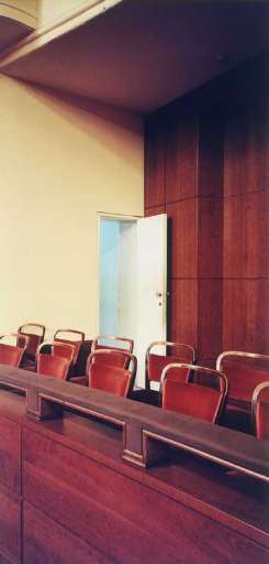 La fotografia sul cavalletto è stata appositamente realizzata in questo luogo da Claudio Gobbi (Ancona 1971): si riconosce un angolo del pavimento a mosaico, il termosifone di foggia antica, la porta di legno verde con le ante riflettenti. Sono in tutto tredici gli scatti riuniti sotto il titolo di Persistence (il curatore è Francesco Zanot), realizzati tra il 2003 e il 2006 da questo giovane fotografo che ha dalla sua anche un periodo di lavoro accanto al big Gabriele Basilico (2000-2003). A Milano come a Praga, Varsavia, Parigi, Berlino o San Pietroburgo, Gobbi immortala scorci di interni cristallizzati dove l’individuo è assente o, piuttosto, indirettamente presente attraverso gli oggetti: sedie o poltrone in sequenza, numeri progressivi segnati sulle spalliere, tende, lampade, porte, pavimenti. I luoghi sono spesso vecchi cinema, teatri, sale da biliardo. Luoghi rimasti immutati nel tempo, mentre tutt’intorno il futuro avanza precipitosamente.