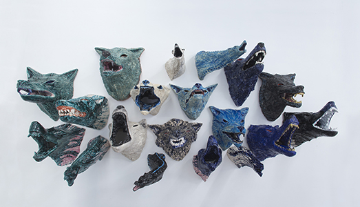 Scilla viene presentata nel primo ambiente della galleria con un grande dipinto ad olio in cui le pennellate materiche e gestuali ricostruiscono la storia dei migratori per eccellenza, gli uccelli. Qui giunti in mare si imbattono in Scilla e le soccombono. La ninfa viene evocata anche dall’installazione di diciotto sculture ceramiche, modellate dall’artista e cotte in collaborazione con i ceramisti di Deruta, che raffigurano teste di lupo alcune dal corpo pesciforme. Il branco delle teste digrignanti, ululanti, feroci e ringhianti colpisce per la varietà formale e cromatica.