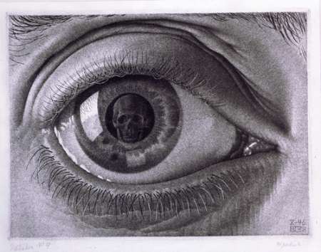 Un grande occhio osserva lo spettatore: nella pupilla nera si specchia un teschio. È la morte, “colei che guarda noi tutti”, disse lo stesso Escher parlando a proposito di una delle sue immagini più famose. E’ l’incipit per una mostra che ha il merito di raggruppare accanto ad una serie di opere celeberrime –quelle con le prospettive aberrate o con le illusioni ottiche- anche alcune serie meno note dell’artista olandese.