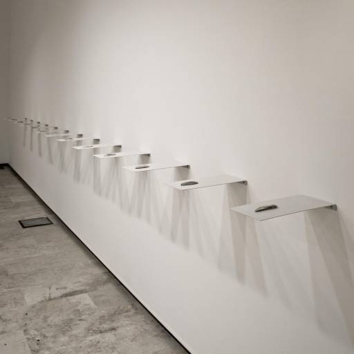 in un colonnato freddo, che taglia lo spazio in verticale. A terra, tracce di