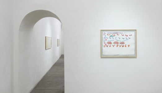 Contrariamente a quanto generalmente si pensa i disegni per Griffa non sono dei bozzetti da cui sviluppare i futuri quadri, ma, al contrario, sono delle opere compiute, delle riflessioni minimali e meditate sull’uso del colore e del segno. Tutta la sua pittura, e questi lavori su carta ne sono la dimostrazione, è un gioco di raffinati equilibri fra ritmo e composizione, come se fossero degli spartiti musicali. Tutti i temi che Griffa sviluppa nelle sue tele sono presenti in questi delicati acquerelli dai Segni primari cioè segni uguali ma diversi, perché diverso è il ritmo che gli imprime la mano, ripetuti sulla tela uno vicino all’altro, gli arabeschi, le numerazioni dove il numero è una lettura del divenire dell’opera stessa ovvero una specie di legenda alla processualità del lavoro e la sezione aurea ovvero il numero infinito con cui secondo l’artista ci possiamo addentrare nei meandri dell’ignoto. Anche nei suoi lavori su carta il colore gioca un ruolo importante contribuendo anch’esso, soprattutto nell’alternanza di caldi e freddi, a dettare il ritmo della composizione.