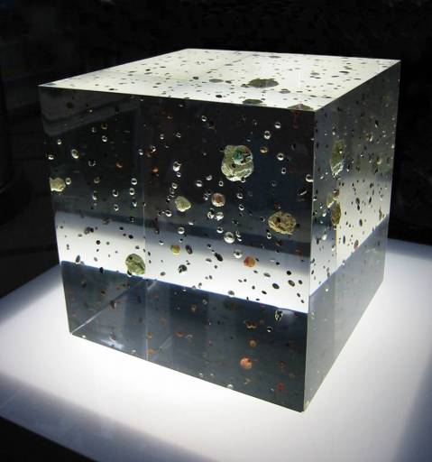 In Untitled (Cosmologia dei legumi), i piccoli volumi leguminosi respirano, trovando una loro autonomia artistica all’interno delle stratificazioni di cera, medium straordinario, essenza stessa della transitorietà. In Bean Cosmos, invece, il cubo trasparente rimanda la presenza di fagioli, lenticchie e via di seguito, associata a piccole pepite auree e palline ottenute accartocciando una mappa del mondo.
