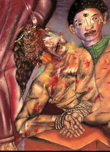 Hanno i colori densi e rugginosi della violenza calata nella dimensione onirica, le storie illustrate da Arturo Elizondo (Città del Messico, 1956; vive a New York). Venti pastelli intrisi di simboli e suggestioni, di straordinario impatto emotivo. Si ispirano -prendendone i titoli-, ai racconti brevi El llano en llamas (La pianura in fiamme), raccolta pubblicata nel 1953 da Juan Rulfo, esponente di spicco della corrente ispanoamericana del realismo magico. Con frasi brevi e immagini secche, l’autore descrive nelle sue pagine la “Cristera” (1926-1929), guerra civile messicana teatro di persecuzioni contro i cristiani, e denuncia lo stato di miseria del popolo, già vessato da una natura matrigna. “Il temporale arrivò all’improvviso, in grandi onde d’acqua… l’unica cosa che potemmo fare fu starcene attaccati sotto la tettoia, guardando come l’acqua fredda bruciava l’orzo giallo tagliato da così poco”. Desolante atmosfera evocata da Elizondo nei pastelli El Diluvio e Es que somos muy pobres. Nella crudezza dei tratti concisi dell’opera Macario, invece, si riconosce il caso di cronaca di “Chacina da Candelaria” (1993): brutale assassinio da parte della polizia militare, di otto adolescenti davanti alla porta di una chiesa.