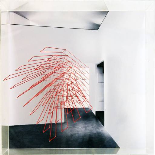 Seguendo il filo di Emanuela Fiorelli dove tutto, come in un vecchio dagherrotipo, si dipana in bianco e nero, emerge, a un tratto, un fil rouge. Dopo una serie di sculture a parete, rigorose e severe sbuca un filo rosso. La sottile scultura si chiama Espansione rossa per Anna, un gentile omaggio alla gallerista che la ospita, Anna Marra. Ma non c’è solo questo filo a sconvolgere il linguaggio consueto di Emanuela, perché dietro le maglie dell’opera s’intravede anche una fotografia, quella della stessa Galleria.