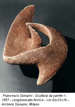 L’ultima sala, a cui si dovrebbe dedicare una sosta adeguata, regala due emozioni. Quella di un periodo artistico fervido e creativo, attraverso foto in bianco e nero, negli appunti dello scultore, nelle righe di saluto dei critici, nei cataloghi delle mostre nell’Italia del boom. L’altro lampo è quello della Scultura da parete I (1957), una forma morbida, porosa, calda, nonostante emerga dal conglomerato ferrico. L’impasto in cemento e limatura di ferro che Somaini aveva brevettato nel ‘53, prefigurandone l’utilizzo in architettura.