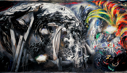 Ennio Calabria, La città che scende – 1963, olio su tela cm. 140×240
