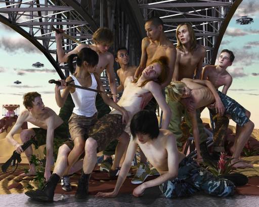 Nell’evento romano è presentata la produzione dell’ultimo decennio, ricostruita attorno ad alcuni nuclei fondamentali: il già citato Last Riot, in particolare, consiste in scene fotografiche e sculture post-apocalittiche di giovani in algida posa da modelli armaneschi-dolcegabbaneschi intenti a sgozzarsi o a bastonarsi a vicenda, caricare ingombranti armi a ripetizione o lottare plastici sotto cieli percorsi da incombenti elicotteri militari. L’effetto, evidentemente, è di profondo disturbo, per quanto percorso dal piacere sottile di rinvenire un culto per l’immagine in guerra che non teme di lasciarsi riportare alle battaglie di Paolo Uccello (ma, intanto, già l’occhio s’impiglia nel riconoscimento di loghi commercialmente più vicini, Nike su tutti).