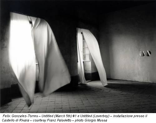 Nel 1991 Felix Gonzalez-Torres (Guáimaro 1957 – Miami 1996) ci ha lasciato una delle più laconiche e agrodolci dediche d’amore mai prodotte in materia di arti visive. Castello di Rivara, l’artista cubano combina le opere Untitled (Loverboy) e Untitled (March 5th) #1, creando un’installazione in cui l’importanza del legame con il compagno scomparso è dichiarata attraverso la duplicità – vincolante e paritetica – di due tende (a loro volta doppie) e due piccoli specchi tondi accostati tra loro. Con questi pochi mezzi il concetto di “coppia” è presto reso assoluto, riformulato in una fondamentale condizione di sussistenza sperimentata sulla propria pelle e restituita pubblicamente con semplicità vera, pura e più forte di qualsiasi preconcetto umano. Una lezione di vita che nasce dall’incondizionata e obbiettiva coscienza degli eventi, pronunciata senza il bisogno di salire in cattedra, fregandosene delle convenzioni (poiché nemmeno contemplate) e procedendo ben oltre il minimo valore degli oggetti manipolati in un razionalismo minimalista sempre carico di sentimento.