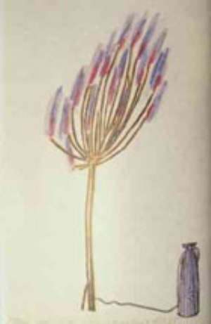 L’allestimento consiste infatti in un ciclo di disegni e di collage che illustrano un percorso intimo, che si snoda attraverso territori poetici e sognanti e che poi troverà la sua realizzazione successivamente in grandi opere, nate dalla fusione dell’alta tecnologia con i materiali naturali.