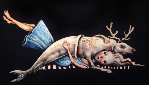 Imboccata l’esile via dei Pettinari, eccoci d’un balzo nella Dorothy Circus Gallery, in un denso e faticoso sabato romano. Accolti dal cinabro dei velluti, solleticati dalla polifonia degli astanti e dall’effervescenza paglierina dei prosecchi, presenziamo con languida curiosità all’inaugurazione di “Illusion”, la prima personale italiana di Afarin Sajedi. Apprendiamo che, in passato, la giovane pittrice iraniana aveva già visitato artisticamente la Capitale partecipando a un paio di collettive di un certo rilievo: a Palazzo Valentini nel 2012 e, l’anno successivo, nello stesso spazio che oggi nuovamente la ospita. Il tratto peculiare di questa appartata galleria romana è da cercarsi nell’interesse dominante per il surrealismo pop, un movimento artistico nato in California una quarantina d’anni fa, promotore di un audace forma di sincretismo: nei moduli estetici della prossimale pop art, avvinta al banale, ripetitivo linguaggio della quotidianità, del fumetto, del cinema, del cartellone pubblicitario, si insinuava la surrealtà del mito e della fiaba, quell’improvviso barbaglio onirico-psichico caratteristico della storica avanguardia bretoniana.
