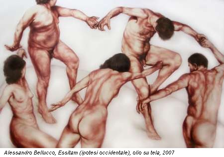 Lo spazio piccolissimo della galleria Container, accoglie due tele di grande formato di Alessandro Bellucco (Torino, 1970), che per questa occasione si è confrontato con due capolavori dell’arte contemporanea: La danza e La gioia di vivere di Henri Martisse. Due tele, quelle del maestro francese, che azzerano lo spessore visivo della forma e del dettaglio figurativo, rendendo il senso del flusso vitale in un’essenza di intensità cromatiche fortemente purificate. Una pittura di colore e di istantaneità, quindi, quella ripresa da Bellucco per la sua analisi impietosa del corpo contemporaneo. Le due tele schiacciano l’osservatore riversando su di lui i corpi dipinti con acume e parsimonia di dettaglio. Bellucco riprende le posture dei due capolavori, le inserisce in uno spazio assente che è il bianco deflagrante della tela, e sostituisce la descrizione essenziale e “musicale” di Matisse con un’analisi dettagliata delle anatomie. L’energia inarrestabile del flusso vitale di Matisse si completa con la pulsione di morte nel disfacimento del corpo di Bellucco, colto in un movimento che lo disintegra.