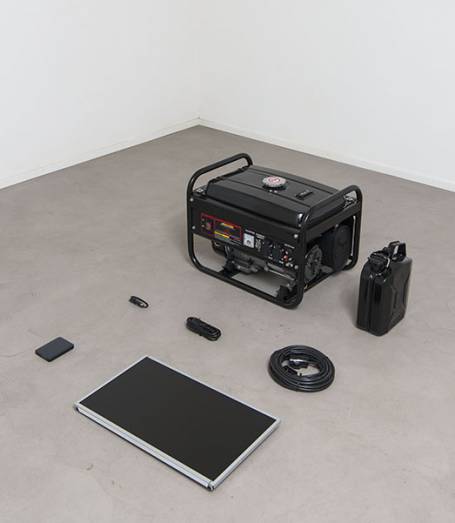 Pamela Diamante Basic Disaster kit, 2018, generatore, tanica, prolunga, schermo LCD, cavo di alimentazione, hard disk, cavo USB, cm 128×87 ph Giorgio Benni