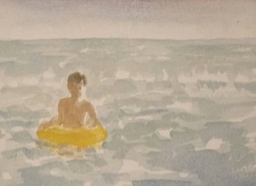 Il percorso si apre con due opere fotografiche di Piero Pompili: una “Sacra famiglia” (1993) di gusto neorealista, che dorme abbandonata e inconsapevole sotto l’ombrellone, e un mosaico di venti piccole stampe di scatti dal 1993 al 2008. Sono visioni di bagnanti con cui il fotografo si ferma a parlare, colti in un breve tratto di spiaggia a Ostia in un lasso di tempo ampio. Nella pulizia del bianco e nero, l’intensità dei ritratti e la lettura antistatuaria dei corpi classici privi di tatuaggi parla di un tempo passato di una leggerezza assolata, tra malinconia e ironia. Gli “Étude puor homme au bain” (2017) di Gonzalo Orquín sono due matite preparatorie per un grande dipinto in via di realizzazione, due pose di uno stesso giovane corpo maschile visto di schiena e intento ad asciugarsi, in un’intimità sensuale intrisa di luce preziosa. Montati come se fossero parte di una stessa sequenza cinematografica, gli “Acquerelliacquatici” dipinti quest’estate da Stefania Fabrizi sono veloci appunti da spiaggia che fanno dell’acqua allo stesso tempo medium e oggetto della rappresentazione. A questi formati minuti, fa da controcanto un lungo velo sul quale sono dipinte le teste di tre nuotatori che affiorano dall’acqua, proposto in modo installativo in una delle vetrine affacciate all’esterno dello studio. “Il nuotatore fa volare in alto le lacrime dell’acqua ferita dal suo corpo”, diapositiva proiettata sul soffitto, è un’opera di poesia visiva di Gea Casolaro del 1994, agli albori del suo percorso da artista. Fu presentata all’epoca alla festa conclusiva di una mostra intitolata “Quadri d’acqua”, una triangolazione fra Marco Bondi, Paolo Fiorentino e lo stesso Ruiu.