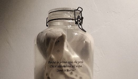 La proiezione di Casolaro dialoga con la videoinstallazione di Massimo Ruiu “Il nuotatore non sa che le lacrime delle sirene sono salate” (1996), a testimonianza del felice connubio fra le poetiche dei due artisti a metà degli anni Novanta. Protagonista del video è un nuotatore che lentamente attraversa lo schermo, parlando di tempo e memoria: un autoritratto della fluidità che, nella constatazione eraclitea dello scorrere, eleva una memoria personale a memoria mitica. Se nella sua prima versione l’installazione – opera viva e contemporanea al suo creatore – prevedeva un filmato a colori su un monitor inserito all’interno di un sarcofago antico riempito di sale, ossatura fossile di un mare ancestrale ormai prosciugato e di cui resta appena un ricordo, oggi viene invece riproposta in bianco e nero, divenendo citazione di se stessa all’interno di una scatola nuova, sempre incrostata di sale, in cui osservare le bracciate ritmiche dell’artista come appariva vent’anni fa. Sono i meccanismi concettuali a interessare Massimo Ruiu e lo dimostrano le altre sue due opere in mostra. Il “Nuotatore” del 1994 dà un ruolo attivo al vetro che solitamente chiude l’opera, trasformandolo in materiale pittorico in virtù di una semplice operazione di ricomposizione degli elementi tradizionali dell’oggetto-quadro, capace di superare il loro valore d’uso. Le scarpe di “Ustica” (2010), conservate in un barattolo pieno d’acqua marina, si annoverano tra i tentativi dell’artista di ricostruire la storia perduta di chi non ha lasciato traccia, di restituire una voce a chi non ha avuto la possibilità di raccontarla. Delle persone scomparse in acqua restano appena i pensieri, suggerisce Ruiu, affidati alle scarpe abbandonate insieme alla necessità della terra. Dal buco nero della storia, un tributo ai fantasmi di coloro che, nell’affollato teatrino dei bagnanti d’occasione, sono gli ospiti fissi e invisibili a cui nessuno bada più.