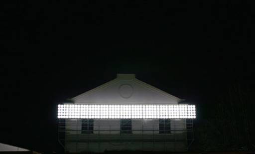 Il primo evento di Dialoghi con la città, intelligente iniziativa del Maxxi curata da Laura Cherubini, vede protagonista Massimo Bartolini (Cecina, 1962) con un’istallazione site specific altamente suggestiva. Si tratta di un tessuto luminoso formato da duecentocinquanta lampade tonde al neon, sistemate a ridosso della facciata dell’attuale sede espositiva, a contrasto e in concomitanza con il cantiere del nuovo museo, oltre che della città che lo accoglie.