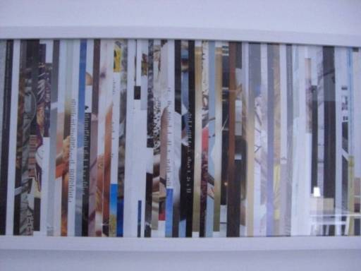 Posizionati ad altezze diverse, alcuni dei quadri così composti trovano posto appoggiati sul pavimento, soluzione curatoriale che si vede sempre più spesso, accompagnata in questo caso da un’assoluta libertà concessa ai fili elettrici, inevitabilmente parte integrante dell’installazione. Risalta così un certo contrasto fra la disciplina dei ritagli e la casualità dell’incedere sonoro, sui cui aleggia la presenza di due lampadine posizionate dall’artista.