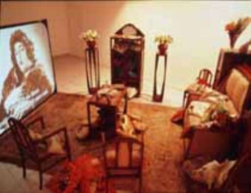 L’installazione La Stupenda rimanda, invece, ad un’atmosfera un po’ datata. In un ambiente arredato con mobili d’epoca, foto scolorite nelle cornici, uno scialle poggiato sullo stipite della porta, vasi colmi di fiori sciupati e ben 35 cuscini, viene proiettato il video in cui è lo stesso artista che –complice la parrucca, la stola di visione e un filo di perle- interpreta il ruolo di una grande cantante lirica in declino. La stupenda, altri non è che la soprano australiana Joan Sutherland, seconda soltanto alla “Divina” Maria Callas. Girato in forma di intervista, il video affronta con punte di ironia e tristezza spaccati del mondo dello spettacolo e della condizione umana in generale. Da questo suo piccolo mondo -un po’ regno, un po’ prigione- la diva parla della sua famiglia e del suo pubblico, lasciando “seccare i petali dei fiori donati dai suoi ammiratori, che utilizza successivamente per riempire i cuscini dove sono ricamate le date e i luoghi dei suoi spettacoli.”