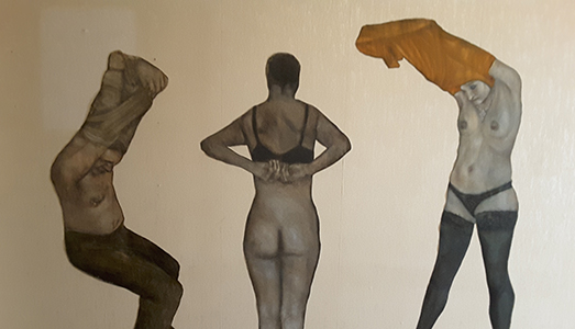 L’artista attraverso un tecnica pittorica impeccabile, rivela le più recondite ossessioni dell’uomo fino a stigmatizzarne quella dolenza che più o meno manifestatamente connota ogni individuo. Un mettere a nudo metaforico ma anche reale come rivelano i suoi dipinti in cui appesantite e scomposte figure sono sovente colte senza abiti o nell’atto di denudarsi, dolenti ma forse anche redente, impegnate a scrollarsi di dosso paure e convenzioni. Un atteggiamento speculativo che l’artista sembra portare alle massime conseguenze – e più visibili parvenze – proprio in Casa Vuota dove una ventina di sagome a grandezza umana, dipinte e ritagliate su tela, si dispongono sulle pareti di un appartamento degli anni sessanta completamente sgombro da mobilia o ingerenze di qualunque tipo. “Lo spazio domestico temporaneamente inabitato – spiega Francesco Paolo Del Re – si popola di una pletora di figure sospese, di personaggi comuni colti da uno sguardo indiscreto in pose antiplastiche, di occupanti precari in uno spazio in prestito”. Una vera casa vuota dunque, ma che nella carta da parati ingiallita e nelle tracce dei quadri e dei mobili alle pareti rivela ancora i segni di un lungo vissuto, di una quotidianità terminata ma non per questo dimenticata, che non si vuole disperdere, di cui anzi si vuole recuperare e preservare quell’affascinante aura di normalità. Quelli di Cetera sono ospiti nel duplice senso del termine: invitati e padroni di casa, discreti quanto ingombranti. Accolgono il visitatore e allo stesso tempo lo respingono esattamente come gli ambienti in cui si è liberi di fantasticare su esistenze lunghe, forse complesse e problematiche, magari serene, ma che lasciano indifferenti. In questo ambiente “gli ospiti” diventano un monito, o meglio uno specchio in cui i visitatori sono chiamati ad identificarsi, magari ad interagire, in forma composta, senza disturbare quel flusso umano colto in abitudinarie e non sempre pudiche attitudini. Un luogo della quotidianità che improvvisamente si scopre non-luogo, un contesto rinnovato a metà in cui entrare in punta di piedi, con garbo, chiedendo permesso sapendo già che nessuno risponderà.